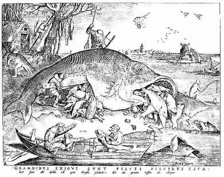 Pieter Bruegel d.Ä.: Die großen Fische fressen die kleinen (1557), Kupferstich von Pieter van der Heyden.