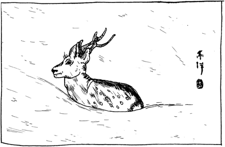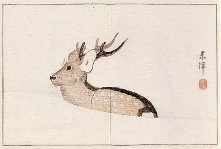 Azuma Tōyō (1755–1839): Deer in snow (The Kyoto Picture Garden, 1814, Blatt 9). In: Roger S. Keyes, Ehon. The Artist and the Book in Japan, New York 2006, S. 192.
