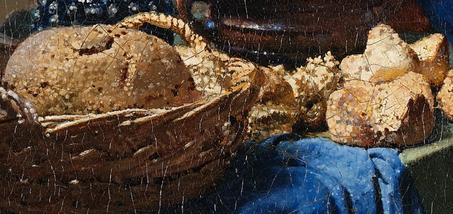 Johannes Vermeer: Dienstmagd mit Milchkrug (Detail; um 1660), Rijksmuseum, Amsterdam. – Vgl. dazu Das Farbenbuch. Pigmente, Pigmentanalysen, Farbgeschichten, hg. von Stefan Muntwyler et al., Elsau 2022, S. 286f.